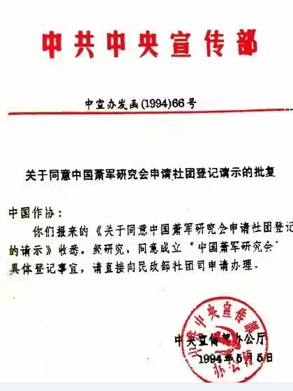中共中央宣傳部關(guān)于同意成立中國(guó)蕭軍研究會(huì)請(qǐng)示的批復(fù)文件