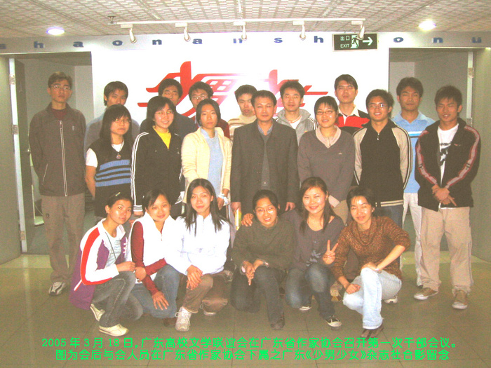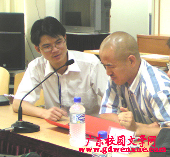 2005年10月15日,第一屆廣東高校文學(xué)社團(tuán)交流會在廣東省作家協(xié)會會議室隆重召開,眾多領(lǐng)導(dǎo)和嘉賓以及來自廣東地區(qū)40所高校的120多名文學(xué)社團(tuán)代表出席了會議,從而成功地將廣東地區(qū)特別是廣州地區(qū)本科和專科院校的文學(xué)社團(tuán)打成一片。從此,廣州地區(qū)的文學(xué)社團(tuán)活動,徹底告別了各社“自掃門前雪”、缺乏交流和合作的局面,動輒就以數(shù)十個兄弟社團(tuán)派代表相互捧場的形式出現(xiàn),標(biāo)志著廣東高校校園文學(xué)界進(jìn)入一個精彩的新時代!圖為時任廣東省社會科學(xué)院主任、廣東省文化傳播學(xué)會副秘書長、著名詩歌評論家朱子慶同志(右)和湯炎忠(左)在會前親密交流。