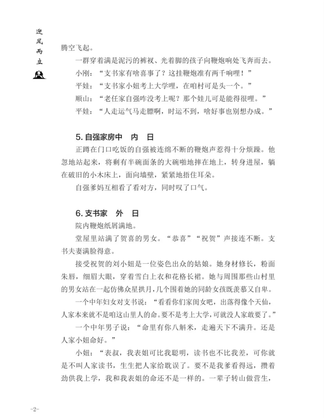 近期,由廣州市青年作家協(xié)會策劃、革命戰(zhàn)士常懷陽力作《迎風(fēng)而立》由陜西太白文藝出版社出版發(fā)行。《迎風(fēng)而立》是一本二十集電視連續(xù)劇劇本,主要講述20世紀(jì)90年代初農(nóng)村高考落榜生任自強剛毅堅卓、自強不息的勵志故事。