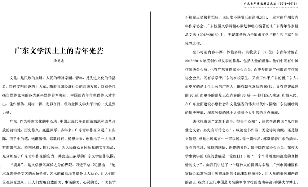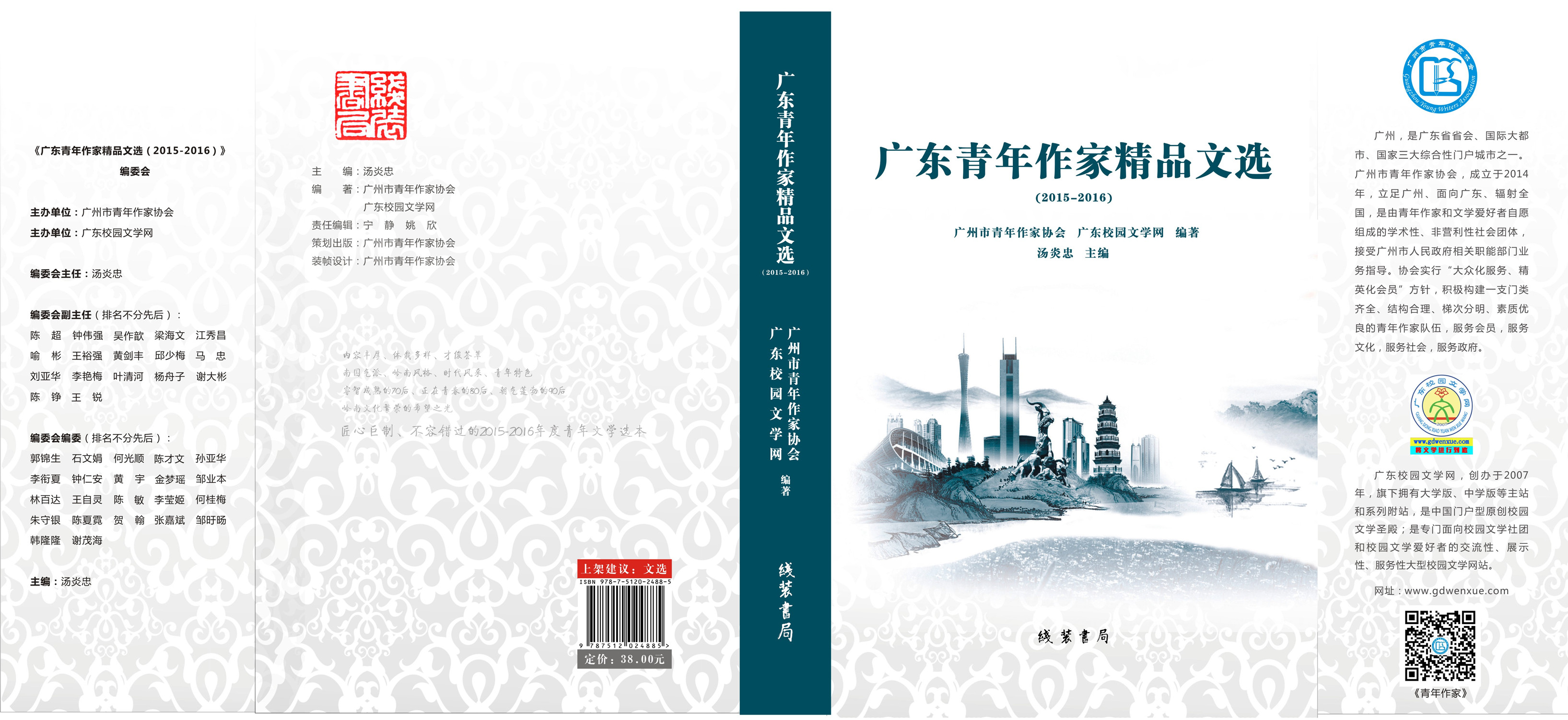 2016年11月20日,由廣州市青年作家協(xié)會(huì)、廣東校園文學(xué)網(wǎng)編著,線裝書局出版的《廣東青年作家精品文選(2015-2016)》正式出版發(fā)行。《廣東青年作家精品文選(2015-2016)》全書共432P,可謂內(nèi)容豐厚、體裁多樣,共收錄了37位廣東青年才俊在2015-2016年度創(chuàng)作或發(fā)表的作品,包括大量的新作。他們中既有中國(guó)作家協(xié)會(huì)會(huì)員,也有廣東省作家協(xié)會(huì)會(huì)員,而更多的是廣州市青年作家協(xié)會(huì)會(huì)員;既有求學(xué)于廣東的在校學(xué)生,又有工作于廣東的新廣東人,而更多的是土生土長(zhǎng)的廣東人;既有朝氣蓬勃的90后,又有睿智成熟的70后,而更多的則是正在青春的80后……他們深入生活、扎根人民,在廣東全面建設(shè)小康社會(huì)和文化強(qiáng)省的偉大時(shí)代中,描繪廣東波瀾壯闊的歷史變革、深厚獨(dú)特的風(fēng)土人情或個(gè)人生活的點(diǎn)點(diǎn)滴滴。