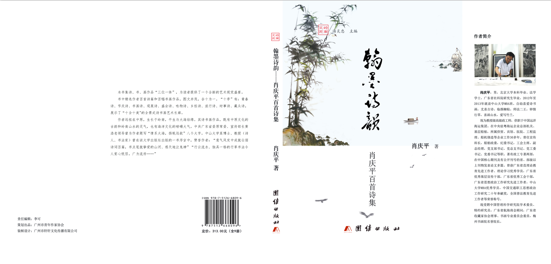 2019年3月31日,肖慶平詩(shī)集《翰墨詩(shī)韻》由廣州市青年作家協(xié)會(huì)策劃,團(tuán)結(jié)出版社公開(kāi)出版發(fā)行。 本書(shū)集詩(shī)、書(shū)、畫(huà)作品“三位一體”,為讀者提供了一個(gè)全新的藝術(shù)視覺(jué)盛宴。 書(shū)中精選作者百首詩(shī)篇和百幅書(shū)畫(huà)作品,圖文并茂,合十為一。“十季”有:青春詩(shī)、節(jié)慶詩(shī)、書(shū)畫(huà)詩(shī)、觀展詩(shī)、盛會(huì)詩(shī)、詠物詩(shī)、鄉(xiāng)祖詩(shī)、旅行詩(shī)、時(shí)事詩(shī)、藏頭詩(shī),展示了“十全十美"的全景式詩(shī)書(shū)畫(huà)藝術(shù)長(zhǎng)廊。 作者遠(yuǎn)祖在中原,生長(zhǎng)于嶺南,平生與大海結(jié)緣。其詩(shī)書(shū)畫(huà)作品,既有中原文化的古韻和嶺南山水的靈氣,也有海洋文化的磅礴大氣。中共廣東省委原常委、宣傳部長(zhǎng)黃浩老領(lǐng)導(dǎo)曾為作者題寫(xiě)“情系大海,揚(yáng)帆遠(yuǎn)航”八個(gè)大字。中山大學(xué)某博士、教授(詩(shī)人、書(shū)法家)曾在該大學(xué)出版社出版的一書(shū)序言中,贊譽(yù)作者:“意氣風(fēng)發(fā)中成就壯麗詩(shī)詞百篇,書(shū)點(diǎn)筆就摯愛(ài)的山河、感天地泣鬼神”“行云流水、獨(dú)具一格的行草書(shū)法令人賞心悅目,廣為流傳……”