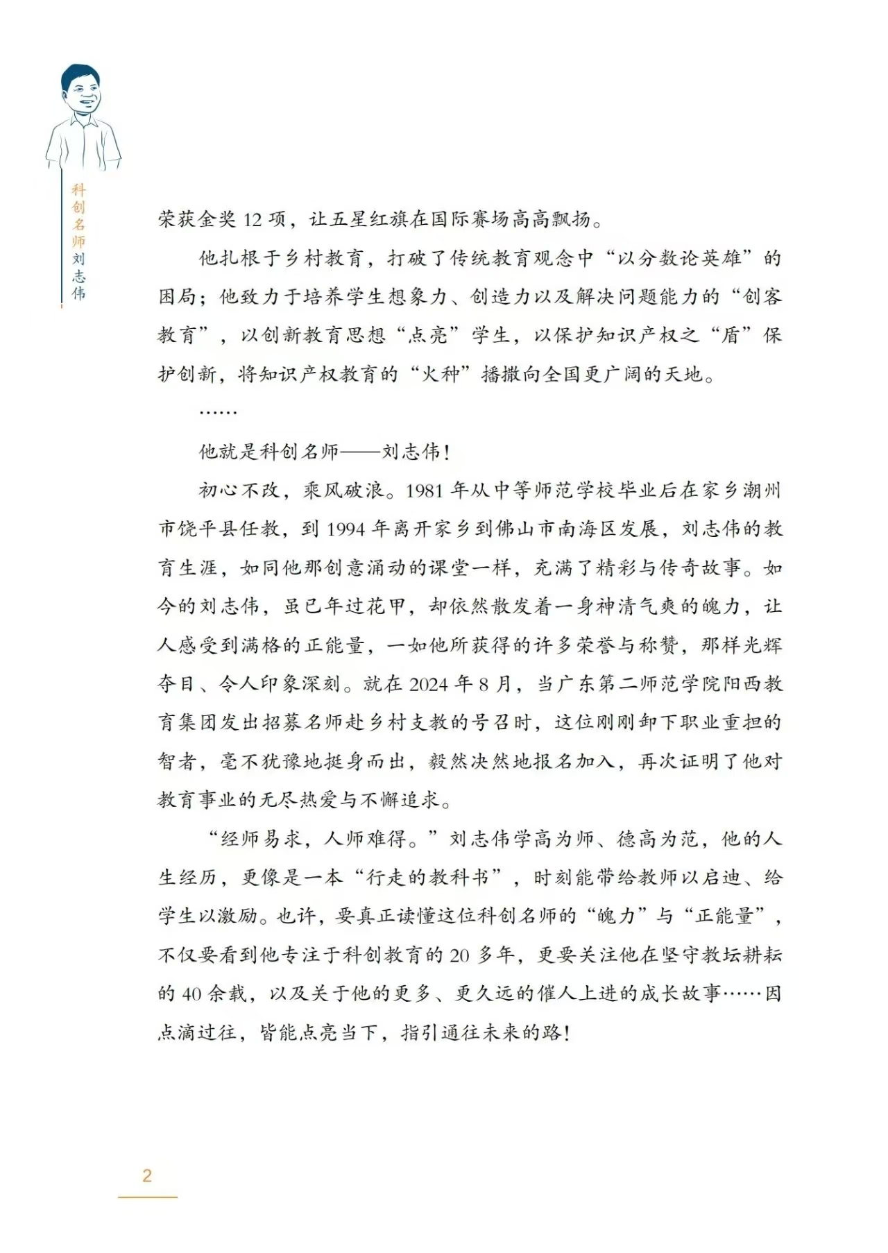 近日,廣州市青年作家協(xié)會(huì)主席湯炎忠最新長(zhǎng)篇報(bào)告文學(xué)力作《科創(chuàng)名師劉志偉》由廣東人民出版社正式出版發(fā)行。該書(shū)以樸實(shí)的語(yǔ)言、細(xì)膩的筆觸和豐富的故事,記錄了國(guó)家級(jí)名師劉志偉在我國(guó)科創(chuàng)教育領(lǐng)域奮斗成長(zhǎng)的點(diǎn)點(diǎn)滴滴。他的作品和事跡,不僅贏得了學(xué)生的喜愛(ài)和尊敬,也獲得了社會(huì)的廣泛贊譽(yù)。他用自己的行動(dòng)詮釋了什么是真正的教育者、大先生,為廣大教師樹(shù)立了榜樣。